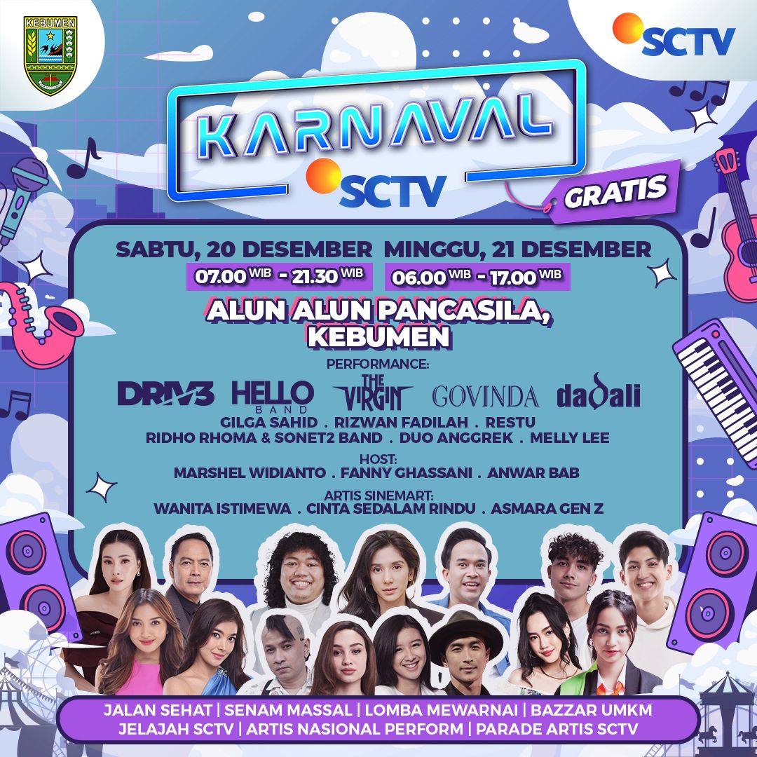 “Karnaval SCTV” akan berlangsung pada hari Sabtu, 20 Desember 2025 hingga Minggu, 21 Desember 2025 bertempat di Alun-Alun Pancasila Kebumen – Jawa Tengah. Marshel Widianto, Fanny Ghassani, dan Anwar BAB akan memandu kemeriahan “Karnaval SCTV” selama dua hari berturut-turut di Kebumen – Jawa Tengah.