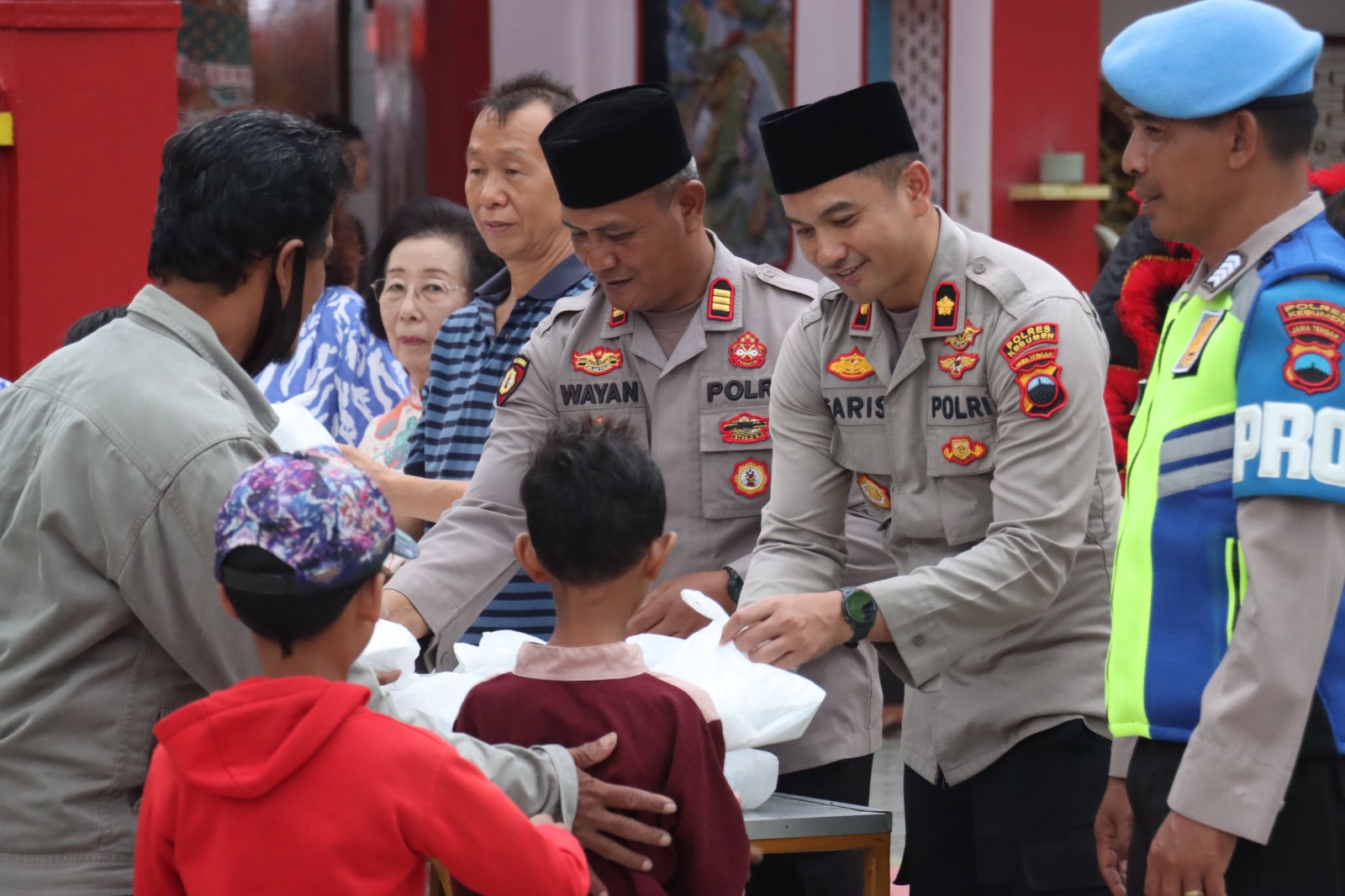 Pengurus klenteng dan anggota Polres Kebumen berdiri berdampingan membagikan paket demi paket kepada warga. Mereka datang silih berganti, sebagian berhenti sejenak untuk menyaksikan barongsai sebelum menerima takjil.